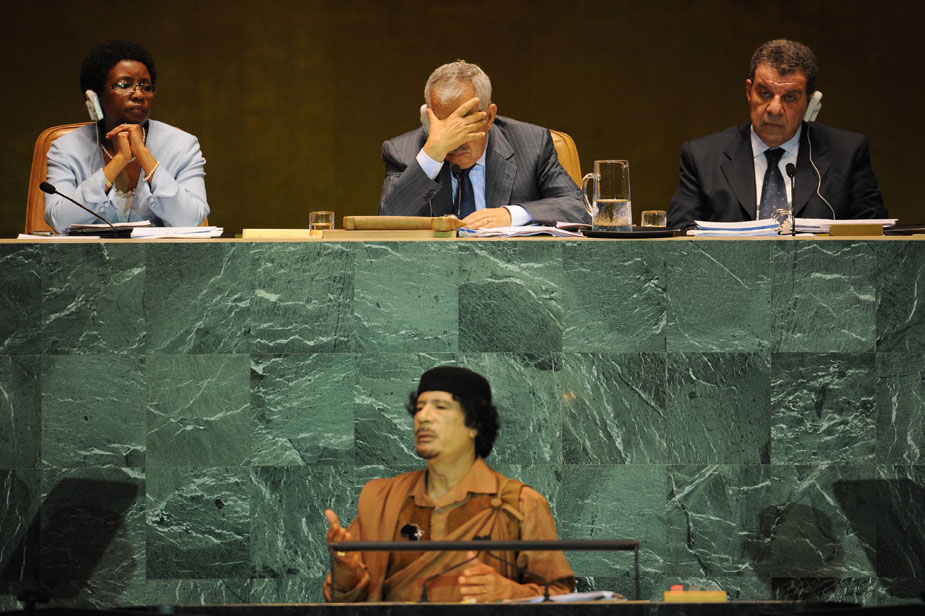 執政40年來首次在聯合國亮相的利比亞領導人卡扎菲,23日在聯大一般性辯論上發表演講,強力攻擊安理會和聯合國的現有體制,并將原定15分鐘的演講拖到一個半小時,很多國家代表團成員最后堅持不住,紛紛離開會議現場。圖片來源:中國新聞網