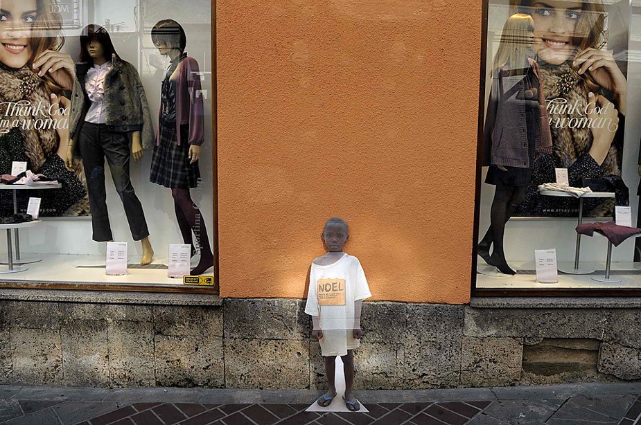 在斯洛文尼亞的盧布爾雅那街頭,聯合國兒童基金會放置了一個小乞丐的圖片紙板,以引起人們關注那些身處困境的盧旺達兒童。圖片來源:中國新聞網