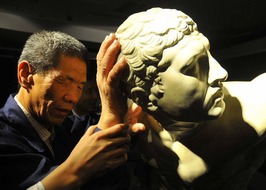 21日,由法國盧浮宮博物館、中華世紀壇世界藝術館等機構聯合主辦的《觸·覺——從盧浮宮到世紀壇》藝術展在中華世紀壇世界藝術館開幕,共展出公元前二世紀到十九世紀西方經典雕塑的復制品和中國當代藝術品二十三件。這是中國大陸首次為視覺殘障人士舉辦的藝術展。該展十一月起開始在福州、武漢及香港等地巡展。圖為視障人士利用觸覺方式欣賞精典作品。潘旭臨 攝圖片來源:中國新聞網