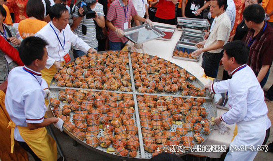 9月26日,蘇州唯亭鎮(zhèn)陽澄湖大閘蟹開捕節(jié)上一口直徑2米的大鍋一次蒸出2009只大閘蟹,并邀請(qǐng)?zhí)K滬杭三地市民到場(chǎng)共同品蟹。圖片來源:中國新聞網(wǎng)