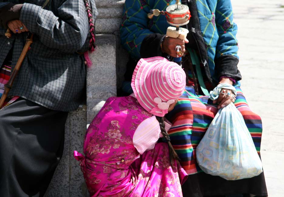 穿著藏袍的小姑娘躲閃著記者的鏡頭,露出帽子上可愛的小花。她身旁是布達拉宮外虔誠的轉(zhuǎn)經(jīng)者。