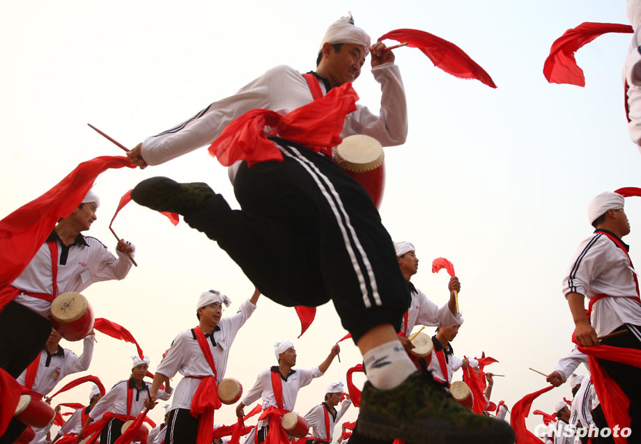 9月16日,千余名來自陜西安塞的腰鼓隊員在北京密云訓練基地和其他方陣合練。該方陣隊員全部是來自陜西省延安市安塞縣的農民,10月1日他們將走在群眾游行隊伍中,在天安門城樓前舞起安塞腰鼓。該方陣也是群眾游行隊伍中唯一一支京外隊伍,唯一一個全部由農民組成的方陣。 中新社發 杜洋 攝