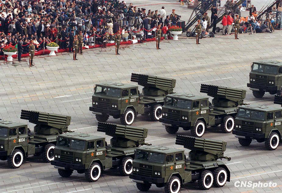 圖為1999年國慶閱兵中的輪式122式自行火箭炮方隊。 中新社發 任晨鳴 攝