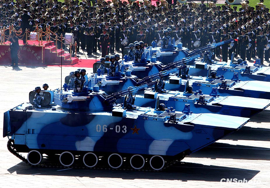 10月1日,中華人民共和國成立60周年慶祝大會在北京天安門地區(qū)及長安街沿線舉行。圖為海軍05式兩棲步戰(zhàn)車方隊通過天安門廣場。首次亮相的05式兩棲步戰(zhàn)車是海軍陸戰(zhàn)隊新一代主戰(zhàn)裝備,信息化程度較高,安裝了先進的火控系統(tǒng)、衛(wèi)星定位系統(tǒng)、夜視系統(tǒng)、一體化通訊系統(tǒng)等。同時,步戰(zhàn)車火力系統(tǒng)得到全面提升,裝備了反坦克導彈、速射炮和高射機槍,能有效應對來自坦克和直升機的威脅。中新社發(fā) 任晨鳴 攝
