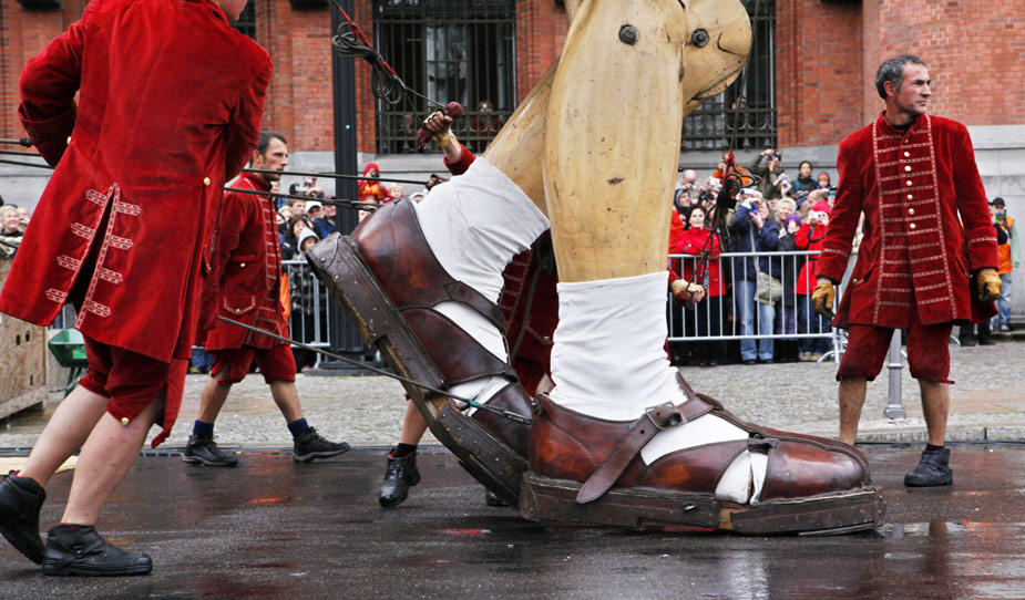 10月2日,來自法國一家戲劇公司的兩個巨型提線木偶亮相柏林街頭,它們將在露天劇場進行表演,以此紀念柏林墻推倒20周年。