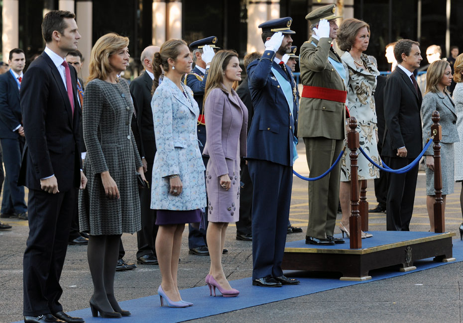 圖為西班牙國王卡洛斯與王儲費利佩等人在首都馬德里觀看國慶閱兵儀式。
