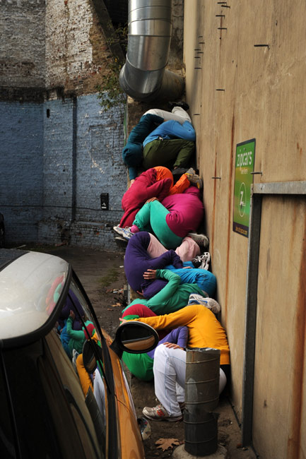 10月16日,來(lái)自?shī)W地利的藝術(shù)家威利·多勒帶著他的城市空間人體藝術(shù)團(tuán)隊(duì),在倫敦街頭進(jìn)行藝術(shù)表演。幾十位表演者把自己的身體擠進(jìn)通道入口、壁凹和任何能找得到的公共建筑的縫隙內(nèi),供人們欣賞。