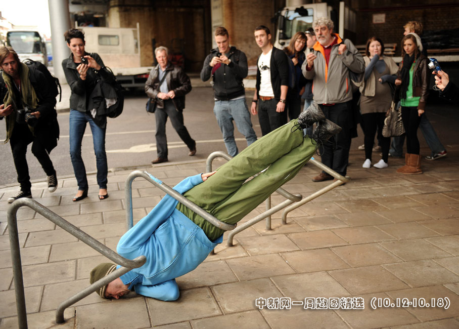 10月16日,來自奧地利的藝術家威利·多勒帶著他的城市空間人體藝術團隊,在倫敦街頭進行藝術表演。圖片來源:中國新聞網