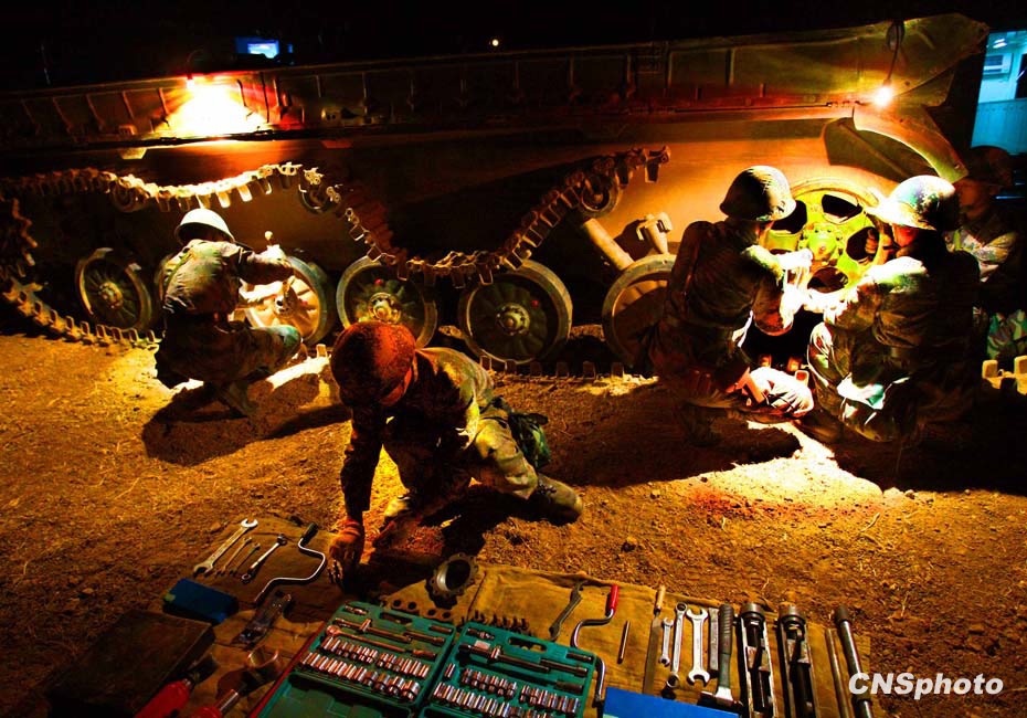 當晚國防大學防務學院、空軍指揮學院的外軍學員,以及英國、以色列、土耳其、巴基斯坦等國軍事觀察員親臨現場觀摩了后勤保障戰斗準備、自行榴彈炮占領陣地、裝甲車輛“摸黑”開進等戰斗要素。圖為戰地搶修裝甲戰車。中新社發 宋吉河 攝