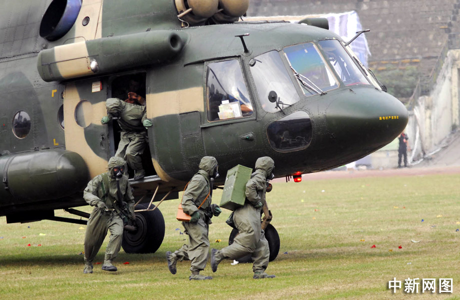 首先趕到現場的是一架米—171直升機,4名防化偵察員全身防護狀態下依次著陸。著陸后,其中2人實施先期偵察,簡單了解情況后對商場外空氣、進出道路及商場外部設施進行偵察,初步查明遭襲情況,并采集收取樣品;另外2人指導公眾防護并協助組織撤離危害區。 郝飛 攝