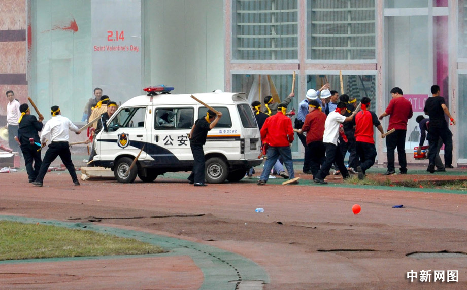 陸續(xù)涌來的“暴徒”,帶來了鐵棍、長刀、鐵鏈等兇器,并結(jié)伙圍打執(zhí)勤民警,出現(xiàn)摔、砸商業(yè)設(shè)施和投擲礦泉水瓶等行為,在廣場上出現(xiàn)了反動(dòng)標(biāo)語,“暴徒”不斷叫囂反動(dòng)語言,引發(fā)附近眾多群眾圍觀,鬧事人群已達(dá)200余人。曹多然 攝