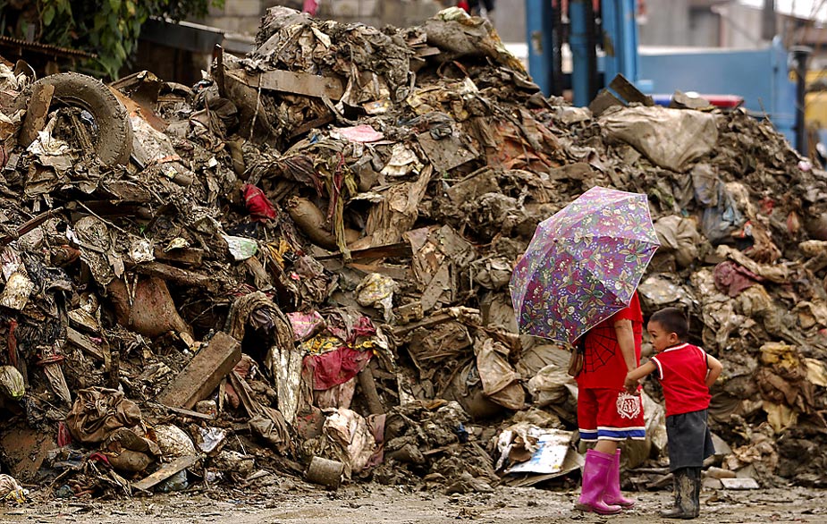 周日(18日),菲律賓馬里基納市一位母親周一帶著孩子走過一堆殘骸。臺風“盧碧”使得這個地區兩次遭遇暴雨侵襲。 來源:中國新聞網