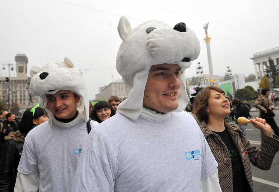 2009年10月24日,當日是350全球應對氣候變化行動日,世界各地的民眾紛紛用自己的方式來表示對全球氣候變化的關注和擔憂。圖為烏克蘭民眾組織的活動。