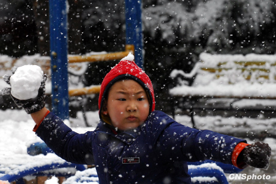 11月1日上午,北京下起一場大雪,為孩子們打雪仗提供了充分的“彈藥”。中新社發 侯宇 攝