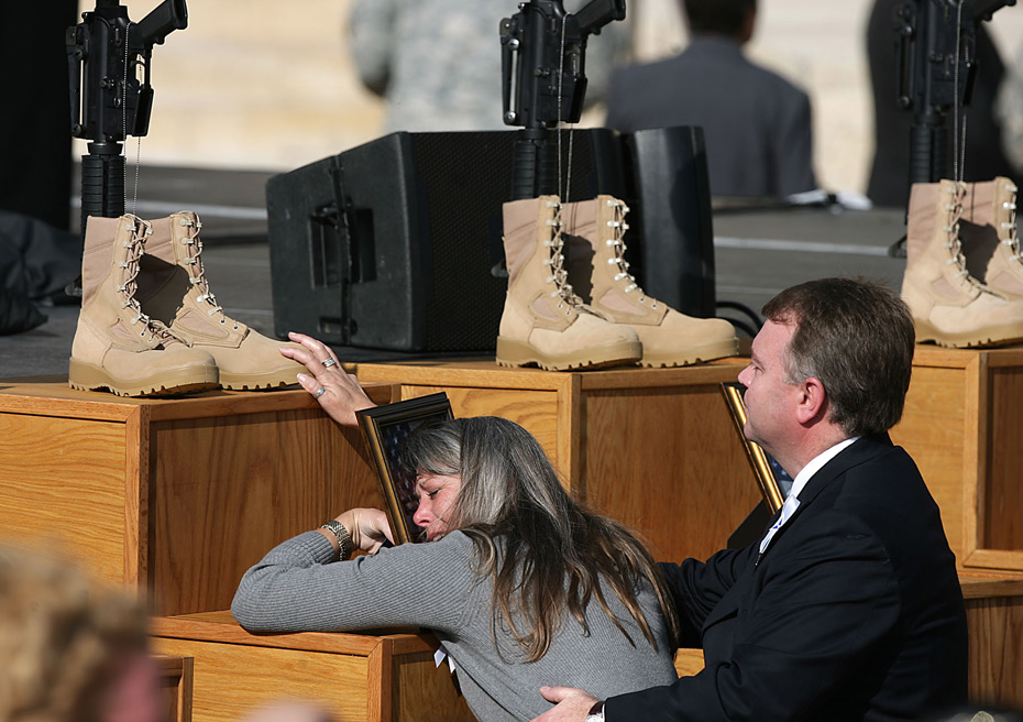 2009年11月10日,在美國(guó)得克薩斯州胡德堡陸軍基地,槍擊案遇害士兵的親屬參加悼念儀式。當(dāng)日,美國(guó)德克薩斯州胡德堡陸軍基地舉行儀式悼念槍擊案遇難者。 圖片來源:中國(guó)新聞網(wǎng)