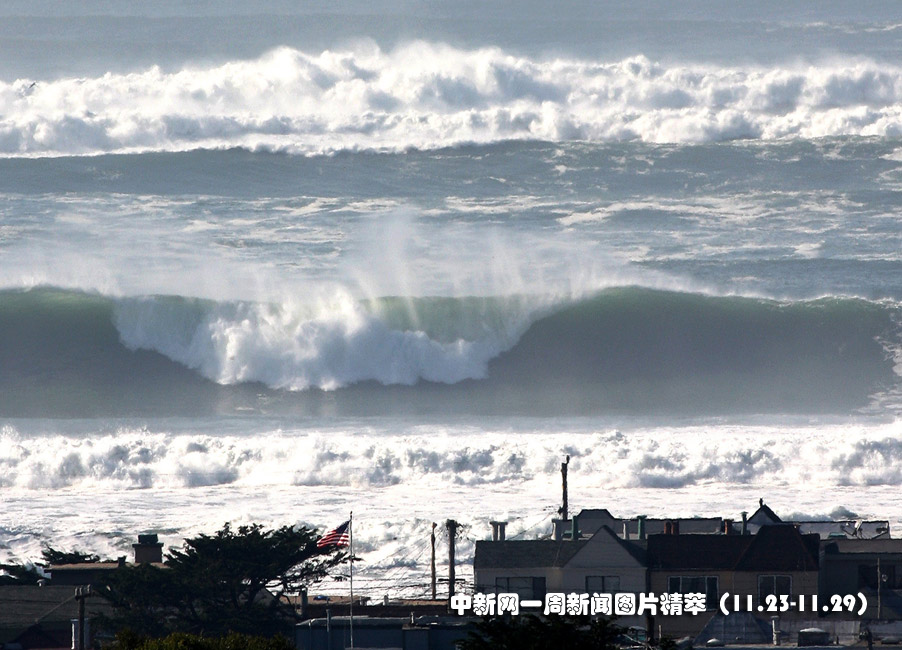 26日(周四),美國加利福尼亞北海岸掀起近30英尺高的巨浪。圖片來源:中國新聞網