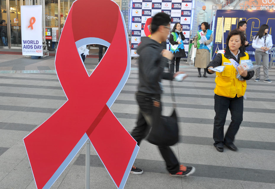 11月30日,韓國首爾,紅十字會工作人員在街頭放置紅絲帶標識宣傳世界艾滋病日。12月1日是世界艾滋病日,2009年世界艾滋病日的主題是“普遍可及和人權”。世界各地民眾組織各種活動呼吁人們關注艾滋病。圖片來源:中國新聞網