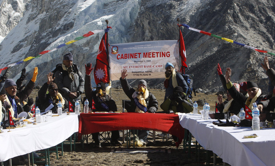 12月4日,尼泊爾總理和22位部長在喜馬拉雅山海拔5262米的高度舉行內閣會議,討論全球變暖對喜馬拉雅山的影響。呼吁人們切實采取行動,保護環境。
