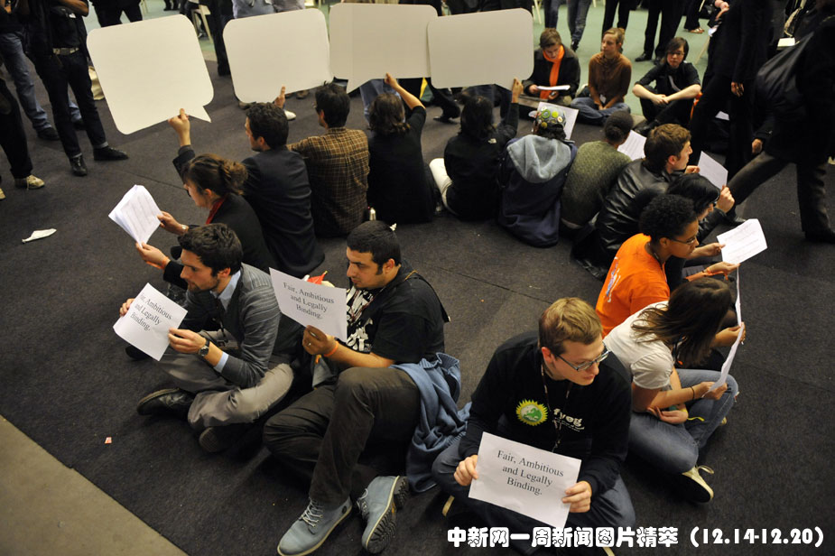 16日(周三),哥本哈根,一群年輕人在貝拉中心靜坐示威,要求聯(lián)合國(guó)氣候變化大會(huì)取得實(shí)質(zhì)成果。圖片來(lái)源:中國(guó)新聞網(wǎng)