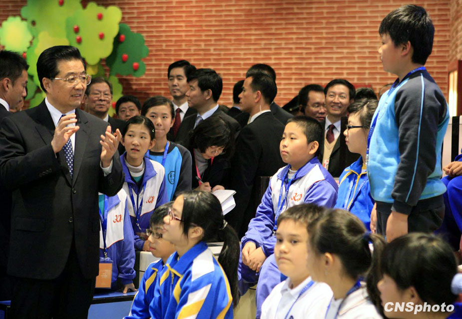 12月19日下午,國(guó)家主席胡錦濤在澳門特首何厚鏵陪同下參觀澳門科學(xué)館,并與當(dāng)?shù)貙W(xué)生親切交流。中新社發(fā) 張勤 攝