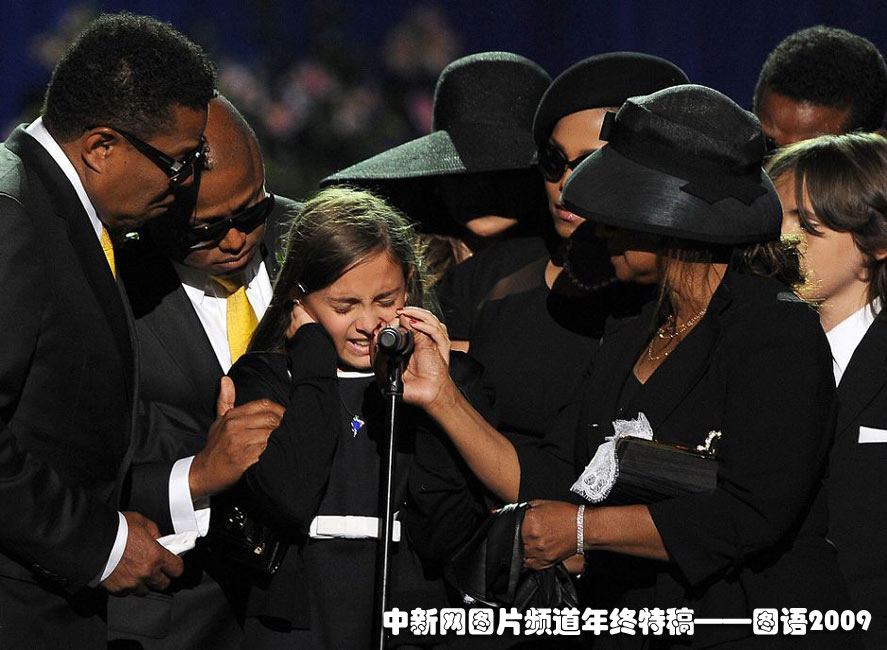 2009年7月7日,在洛杉磯斯坦普斯中心舉行了紀(jì)念邁克爾·杰克遜的追思會(huì)。邁克爾·杰克遜是樂壇傳奇,死于2009年6月25日。追思會(huì)上,邁克爾·杰克遜的家族成員正在安慰的杰克遜的女兒帕麗斯(中)。