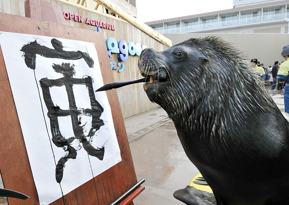 12月30日,日本神奈川八景島海洋樂園水族館內,海獅表演了用毛筆在紙上“寫”漢字的節目。圖片來源:中國新聞網