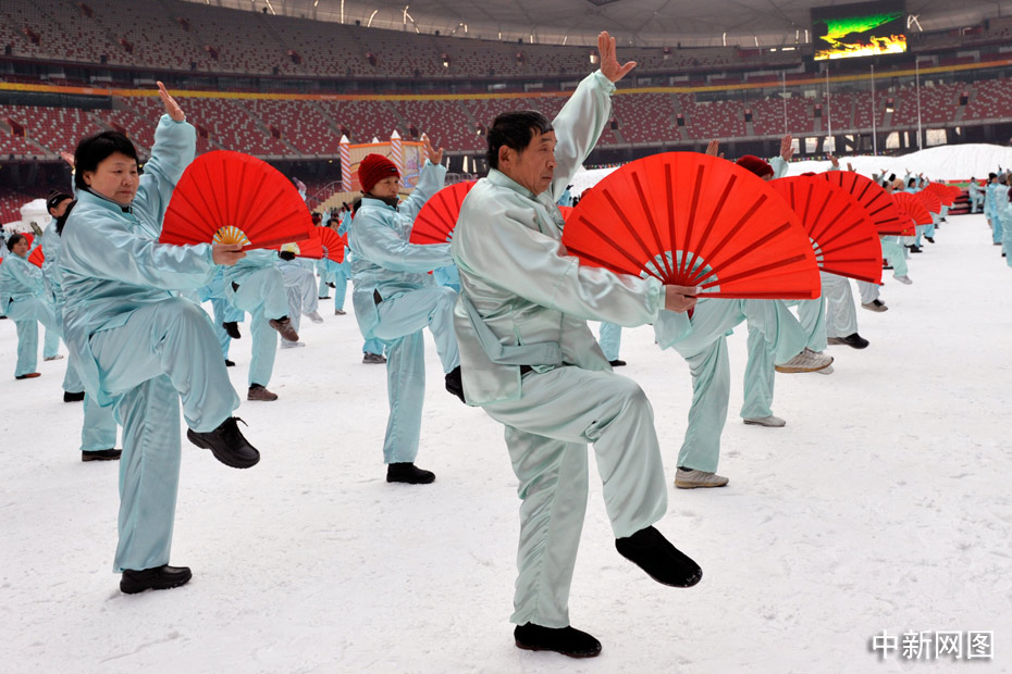 2010年1月1日上午,2010人在被冰雪覆蓋的鳥巢內表演了太極拳、武功扇等民族傳統健身項目。中新網記者 金碩 攝