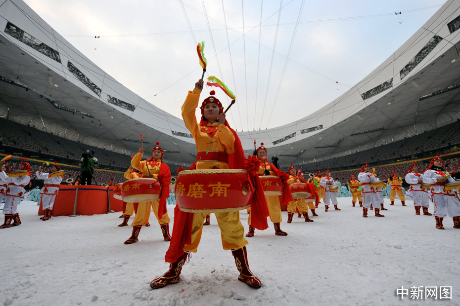 2010年1月1日上午,2010人在被冰雪覆蓋的鳥巢內表演了太極拳、武功扇等民族傳統健身項目。中新網記者 金碩 攝