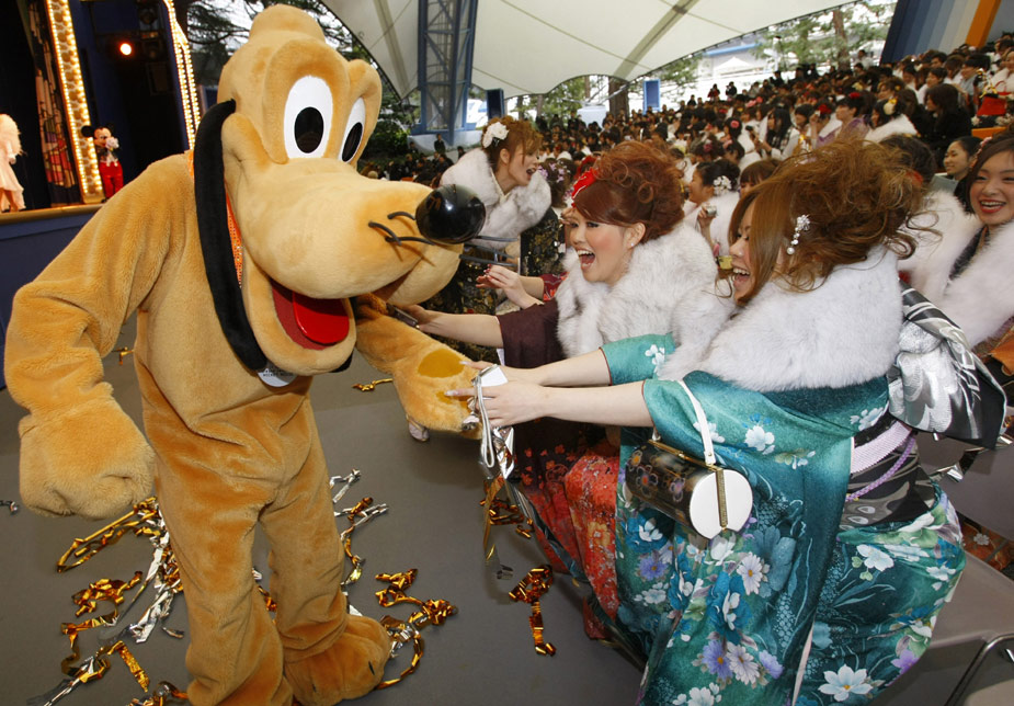 1月11日,日本迎來2010年的成人節日,所有年滿20歲的年輕人都將在這一天宣告自己邁進了成人行列。眾多年輕的日本女孩身穿和服在東京迪斯尼樂園里快樂游玩,迎接自己的節日。