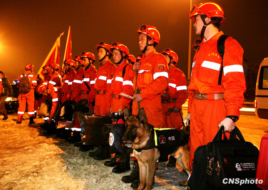 1月13日晚,中國國際救援隊從首都國際機場搭乘飛赴海地執行救援任務。據悉,救援隊一行共計68人,由三個分隊組成,包括來自國家地震局的10人專家分隊等。據了解,救援隊隨機攜帶了總價值約1200萬元人民幣的10余噸救災物資,其中包括救援、通訊、后勤保障、醫療、食品在內等物資設備和三只搜救犬。中新社發 雷虹 攝
