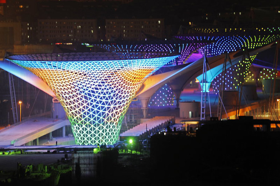 隨著世博腳步臨近,世博工地正熱火朝天的加快施工進度,夜晚世博場館演繹燈光秀。郭長耀/CFP