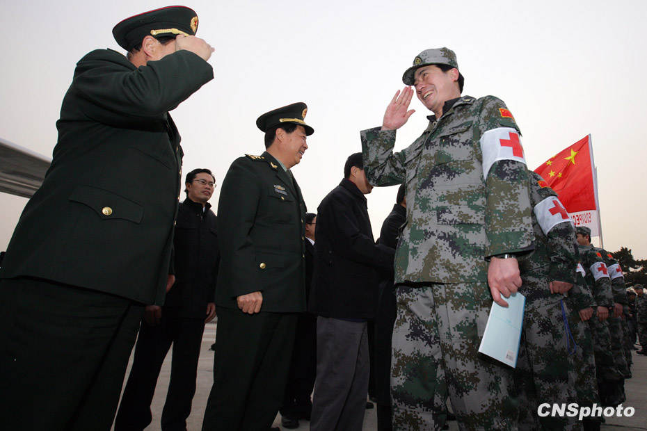 中國人民解放軍醫護人員和管理人員組成的中國醫療防疫救護隊一行40人乘坐軍運包機離開北京,啟程前往海地進行人道主義救援任務。中新社發 劉震 攝