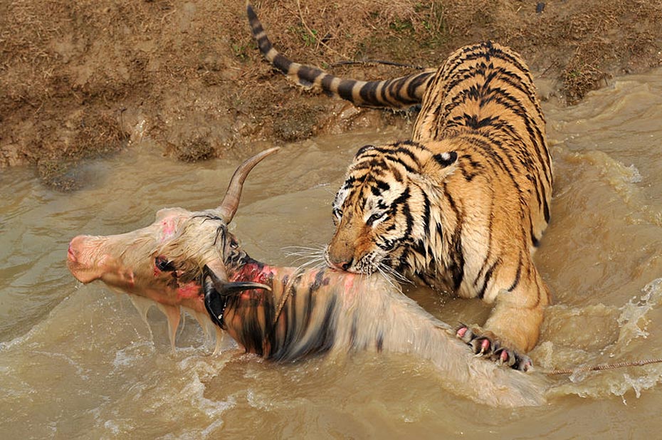 但水中的牦牛一動彈,更加激發了老虎的野性,這時有三、四只老虎撲了上來,工作人員拼命往水塘邊上拽牦牛,無奈一只虎王一下就咬住了牦牛的脖子怎么都不肯松口,繼而上演了人和老虎的“拔河比賽”。