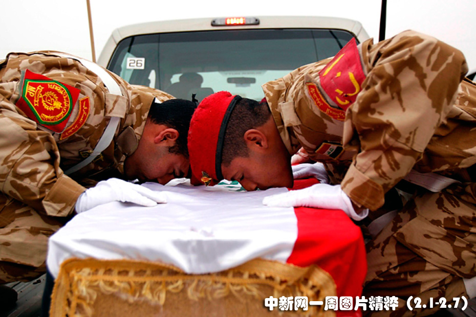 2月4日(周四),伊拉克士兵親吻一名同伴的靈柩,這名士兵的遺體在伊拉克巴斯拉附近的邊界處被交接。在兩伊戰爭中喪生的九名伊拉克人的遺體周四回到伊拉克。圖片來源:中國新聞網