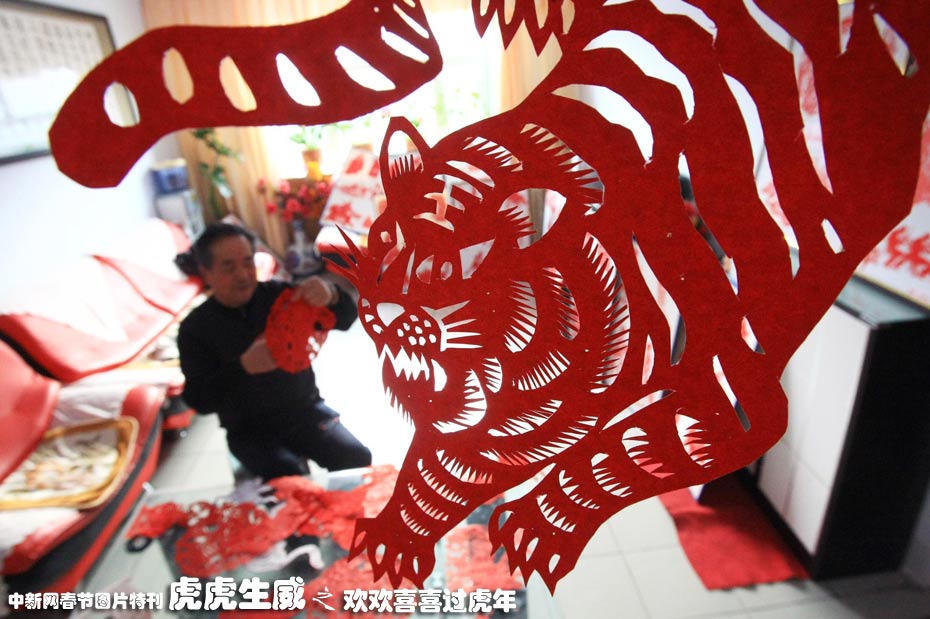2月1日,已有56年剪紙經驗的新疆奇臺縣71歲民間剪紙藝人李萬發正在家中精心剪裁各類虎圖案,準備贈與親朋好友。中國農歷新年即將到來,新疆各地以各種方式迎接農歷虎年的到來。中新社發 劉新 攝