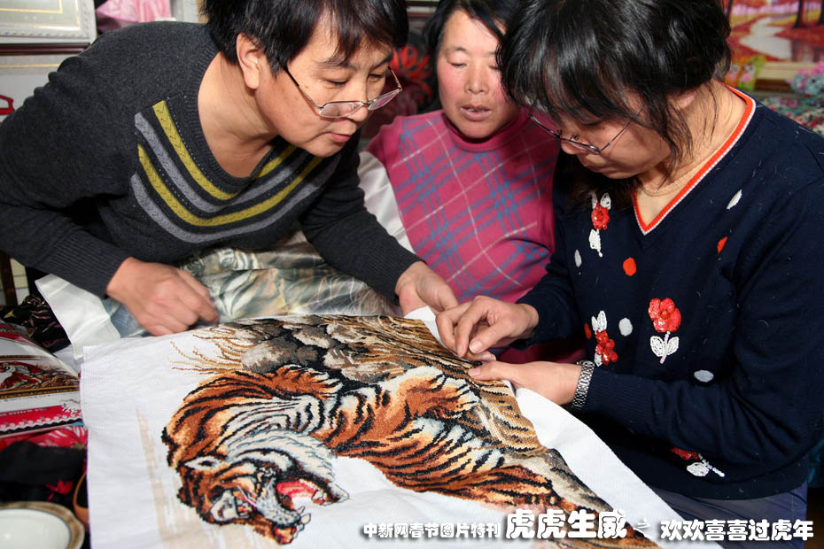 12月21日,市民們展示繡好的“虎年生肖”蘇繡作品。虎年臨近,北京市懷柔區(qū)泉河街道社區(qū)居民蘇繡“虎生肖”圖畫,抒發(fā)對(duì)新年的美好祝福和期盼,歌頌美好生活迎接虎年的到來。中新社發(fā) 卜向東 攝