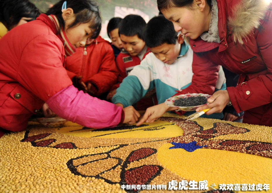 2009年12月中旬,山東省棗莊市山亭區建銀希望小學手工制作興趣小組的學生在老師的指導下,用黃豆、黑豆、小麥、豌豆、小米等糧食粘貼成活潑可愛的“五谷虎”,喜迎即將到來的農歷虎年。圖為棗莊市山亭區建銀希望小學手工制作興趣小組的學生和老師一起制作“五谷虎”。中新社發 李宗憲 攝