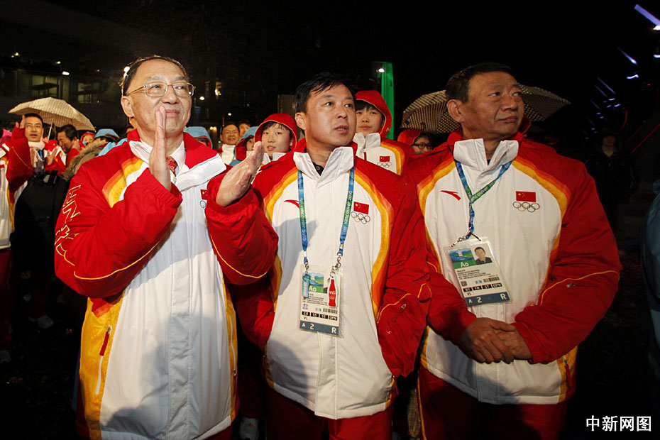 圖為中國(guó)代表團(tuán)團(tuán)長(zhǎng)劉鵬(左)等參加升旗儀式。