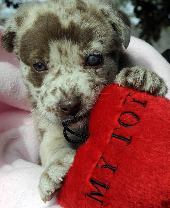 圖為美國一名澳大利亞牧羊犬小狗在玩情人節物品。圖片來源:中國新聞網