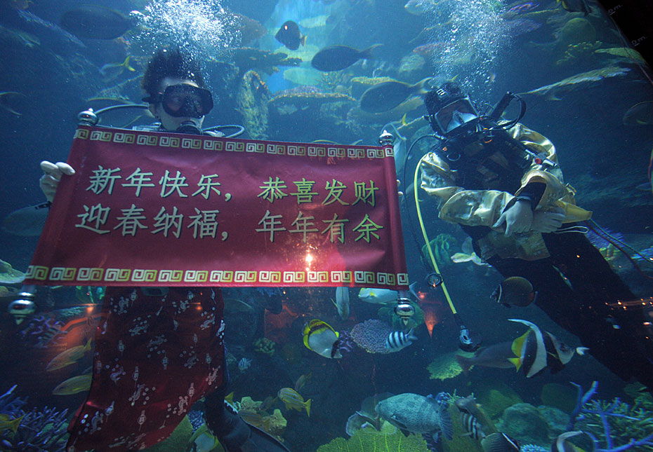 圖為泰國(guó)曼谷水族館潛水員在水中拉起橫幅慶祝新春佳節(jié)。