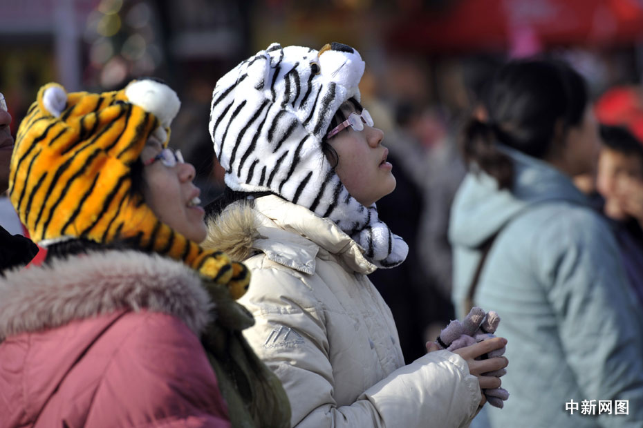 2月14日,農歷正月初一,北京各大傳統廟會、洋廟會爭相開幕,許多游客頭戴虎年飾品開心游廟會。中新網記者 金碩 攝