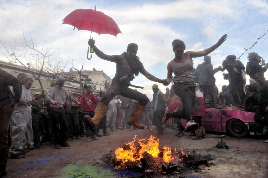 2月15日,希臘港口加拉西迪,狂歡者在街頭參加“面粉大戰”。“面粉大戰”是當地慶?駳g季結束的一項傳統活動,隨后將是為期40天的齋戒月直至復活節。圖片來源:中國新聞網
