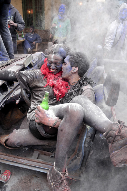 2月15日,希臘港口加拉西迪,狂歡者在街頭參加“面粉大戰(zhàn)”!懊娣鄞髴(zhàn)”是當(dāng)?shù)貞c祝狂歡季結(jié)束的一項(xiàng)傳統(tǒng)活動(dòng),隨后將是為期40天的齋戒月直至復(fù)活節(jié)。圖片來(lái)源:中國(guó)新聞網(wǎng)