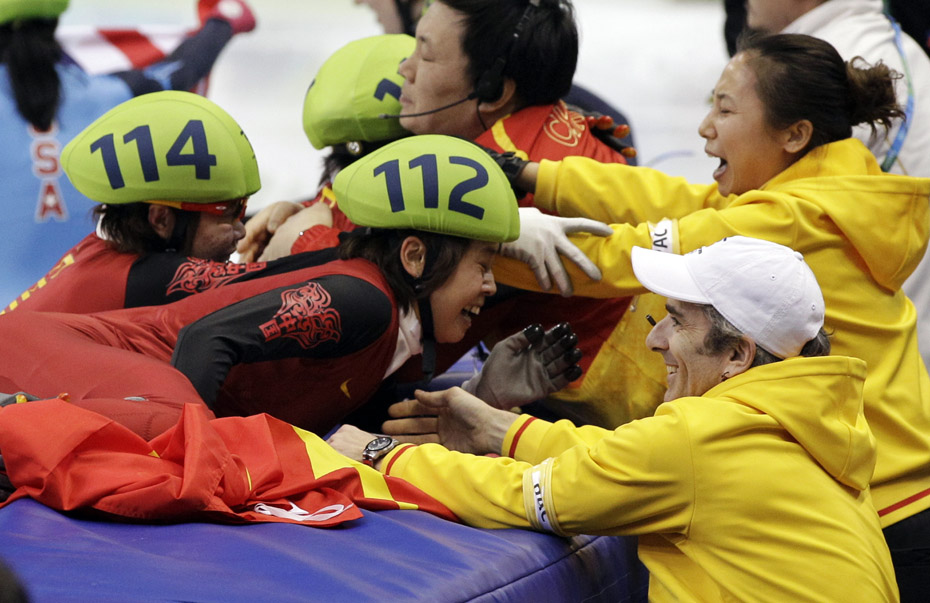 當地時間2月24日,溫哥華冬奧會女子短道速滑3000米接力A組決賽中,中國隊王濛、周洋、孫琳琳、張會四朵金花聯袂出擊,最終將金牌歸入中國隊囊中。圖片來源:中國新聞網