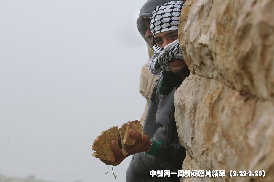 26日(周五),約旦河西岸,幾名巴勒斯坦青年準備向以色列士兵投擲石塊。