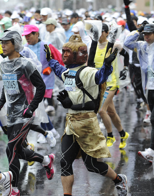 2月28日,日本東京馬拉松賽舉行,超過30000名愛好者參加了此次馬拉松賽。很多參賽者的怪異服裝成為了賽場上的一道風景。圖片來源:中國新聞網