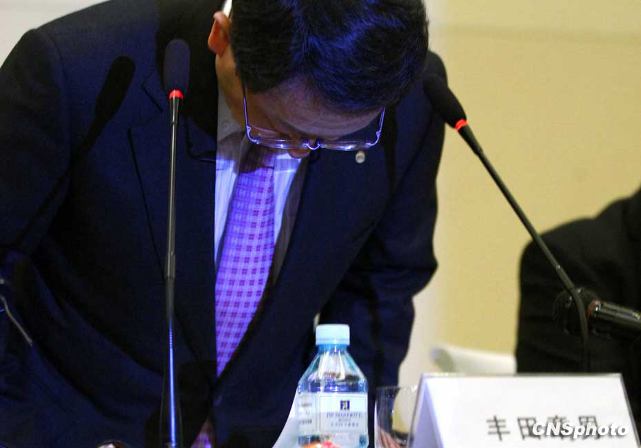 3月1日,豐田汽車總裁豐田章男今日在北京舉行記者會,介紹了豐田汽車大規模召回的原因及處理措施,并向中國消費者鞠躬道歉。