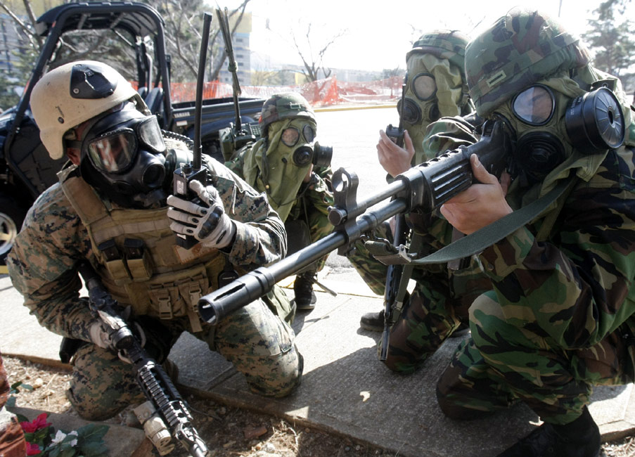 3月11日,在韓國鎮海海軍基地,韓美兩國的海軍陸戰隊舉行了聯合反恐軍事演習。