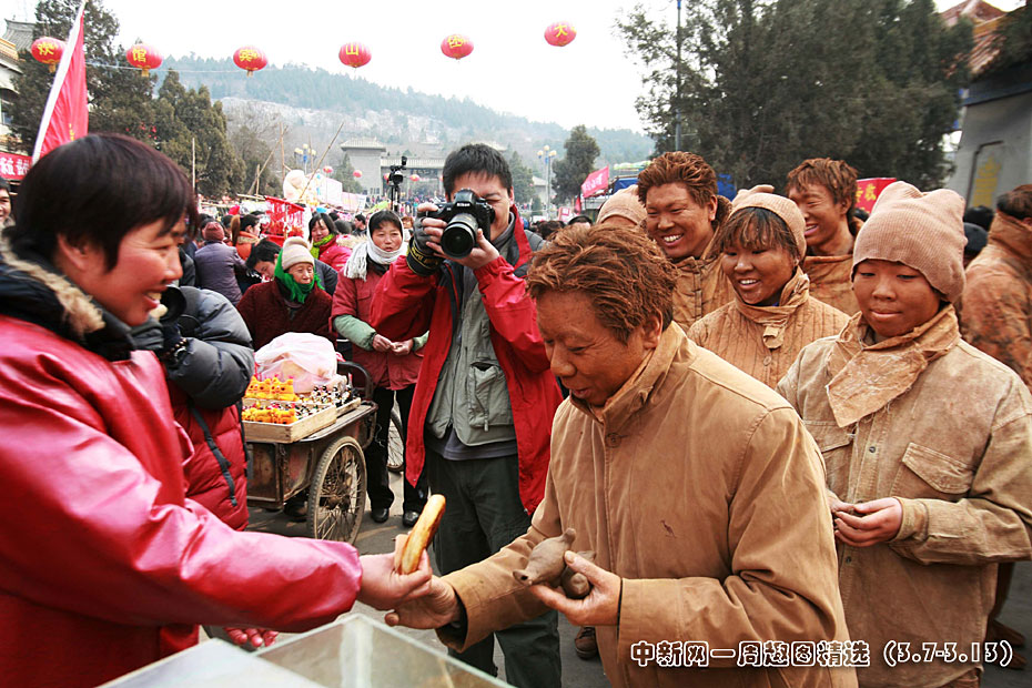 3月7日,一群“泥人”在河南浚縣廟會上自制泥玩具并將與現場商販交換商品。這次“大地上的人”藝術活動是“王剛——老萬系列作品”的第五次行為藝術活動。“老萬”代表“千千萬萬”。本次活動的主題從關注農民工擴展到了關注人類的生存與發展。圖片來源:中國新聞網>>點擊觀看詳細內容