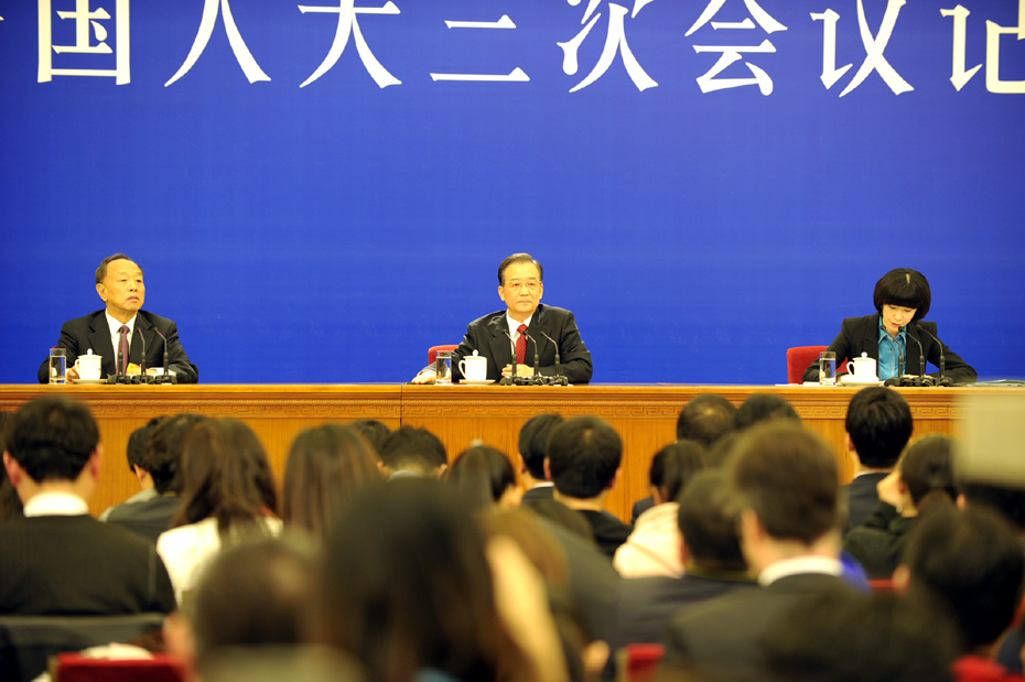 3月14日上午,國務(wù)院總理溫家寶在人民大會堂三樓金色大廳與采訪十一屆全國人大三次會議的中外記者見面并回答記者提出的問題。中新網(wǎng)記者 楊威 攝 圖片來源:中國新聞網(wǎng)